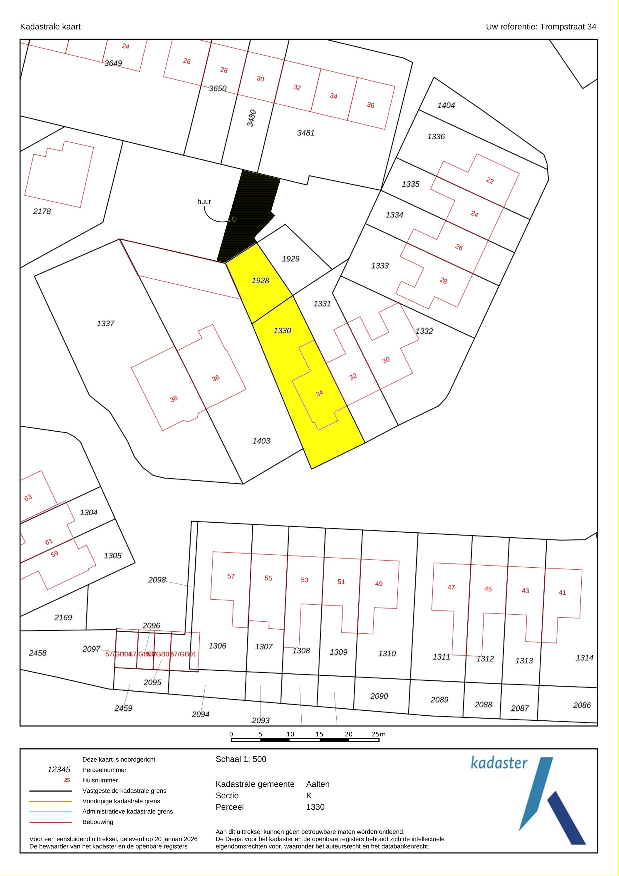 In het verlengde van het perceel huurt verkoper momenteel circa 108 m² grond van de gemeente (zie het gearceerde gedeelte op de kadastrale kaart), waarmee het totale perceeloppervlak op circa 444 m² uitkomt. Voortzetting van dit huurcontract is onder voorwaarden mogelijk. Vraag de makelaar naar meer informatie hierover.