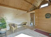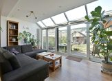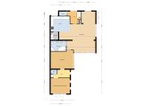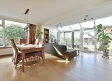 Aan de achterzijde van de woonkamer heb je toegang tot de badkamer en de uitbouw.