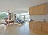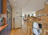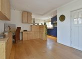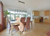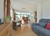 De woonkamer is royaal opgezet en heeft een open verbinding met de keuken. Aan de achterzijde geniet je van een prachtige serre (geplaatst in 2004), die zorgt voor veel natuurlijk licht. De keuken, opgesteld in een praktische L-vorm, ligt aan de voorzijde en is uitgerust met diverse inbouwapparatuur, zoals een vaatwasser, oven, koelkast, afzuigkap en een 4-pits gaskookplaat. Aansluitend aan de keuken bevindt zich een kleine bijkeuken met de opstelling voor de cv-ketel, wasmachine, droger, vriezer en extra bergruimte voor proviand.