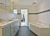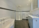 De badkamer is uitgevoerd met een ligbad, douche, een groot dubbel wastafelmeubel en een toilet. Voor extra comfort is de vloer voorzien van vloerverwarming.