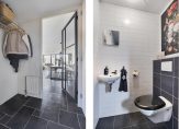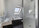 De badkamer is verzorgd en uitgevoerd met zwarte vloertegels en witte wandtegels. Zeer compleet met een ligbad, douche met rainshower, wastafelmeubel met dubbele spoelbak en toilet.