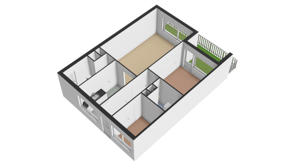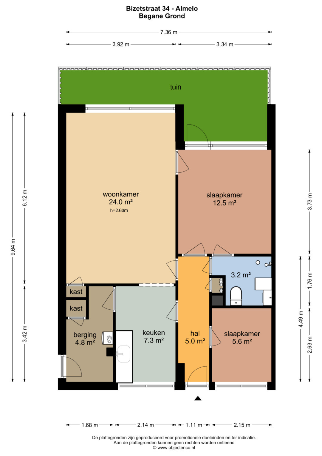 Entree/hal met meterkast, keuken voorzien van keukenblok met spoelbak, woonkamer met vaste kast, twee slaapkamers, waarvan één met toegang tot de tuin, badkamer met douche, toilet en wastafel, en een inpandige berging met opstelplaats voor de cv-ketel.