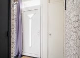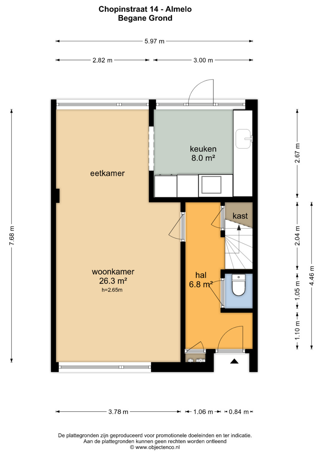 Entree/hal met kelderkast, toilet, vaste trapopgang naar de eerste verdieping, woonkamer en de keuken.