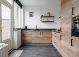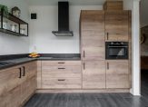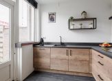 De lichte, halfopen keuken is bereikbaar vanuit de woonkamer en uitgevoerd met een moderne inbouwkeuken met bovenkast ruimte. Het kunststof werkblad is voorzien van een RVS spoelbak. Aan (inbouw)apparatuur zijn aanwezig een RVS afzuigschouw, 4-pits inductiekookplaat, vaatwasser, combimagnetron-/oven, koelkast en een vriezer met drie lades. Vanuit de keuken is er directe toegang tot de zonnig gelegen achtertuin.