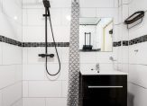 De badkamer is in lichte kleurstelling betegeld en voorzien van een douchegelegenheid en een wastafelmeubel. De ventilatie geschiedt op mechanische wijze.