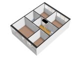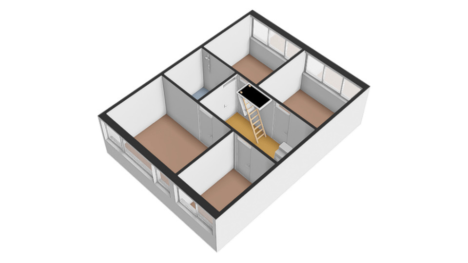 Overloop, de badkamer en een viertal slaapkamers. De slaapkamers meten respectievelijk circa 10, 8, 8 en 5,5 m² en zijn allen afgewerkt met een laminaatvloer.