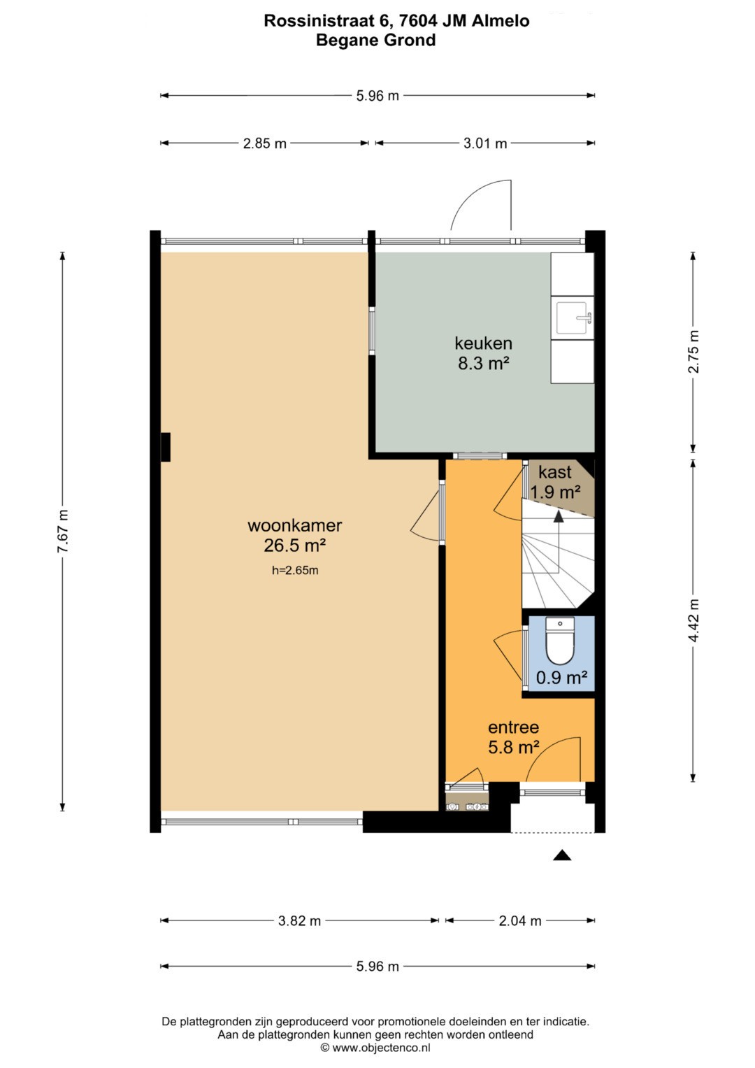 Entree/hal met meterkast, toilet, woonkamer, keuken, provisieruimte onder de vaste trapopgang naar de 1e verdieping.