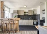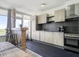 De met zwarte tegels betegelde keuken is opgesteld in een rechte opstelling met bovenkasten en is voorzien van een kunststof werkblad met spoelbak. In de keuken bevindt zich een fornuis (4-pits inductie) met afzuigkap en koelkast. De deur geeft u toegang tot het balkon welke is gelegen op het westen. Vanaf de middag tot laat in de avond kunt u hier heerlijk genieten van de zon en de prachtige zonsondergang.