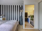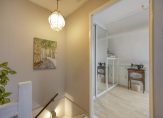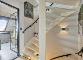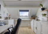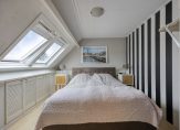 Via de trapopgang komen we op de bovenste woonlaag die toegang biedt tot de slaapkamer, het washok en de voorzolder. Praktische bergruimte onder de schuine kap.