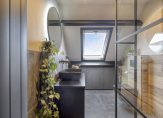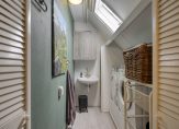 Ideaal is de naastgelegen was-/stookruimte. Onder de schuine kap zijn de wasmachine en droger nu geplaatst met daarbij een gootsteen en de C.V.-ketel is hier netjes verwerkt.