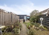 De keuken biedt al een heerlijk uitzicht op de royale achtertuin. Deze tuin is ondanks de uitbouw van goed formaat en biedt alle gelegenheid om een fijn plekje te zoeken in de zon (of de schaduw op de warmste dagen van het jaar). De achtertuin is gedeeltelijk betegeld en gedeeltelijk voorzien van groen en heeft een mooi formaat. Achterin de tuin staat een houten berging met hiernaast de poortdeur naar het achterpad.
