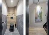 Tussen de keuken en het zitgedeelte ligt de tweede hal. In deze tweede hal bevindt zich de toiletruimte met een vrijhangend toilet en een fonteintje. De toiletruimte is in 2023 gemoderniseerd met fraai zwart sanitair en grote tegels. Via deze tweede hal kunt u de bovengelegen verdieping bereiken.