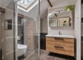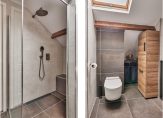 Naast de slaapkamer bevindt zich de in 2022 gemoderniseerde ruime badkamer. De badkamer is betegeld met grote antracieten vloertegels en lichtgrijze wandtegels. De houtlook meubels en de balken op het plafond maken het een hele aangename en sfeervolle badkamer. De ruimte is voorzien van een super ruime inloopdouche, vrijhangend toilet (sanibroyeur), groot wastafelmeubel, designradiator en een netjes weggewerkte opstelplaats voor de wasmachine.