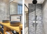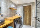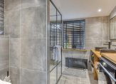 Ook de badkamer is op de begane grond gelegen en bevindt zich in de uitbouw. De badkamer is modern afgewerkt en in 2020 nog vernieuwd. De badkamer is op de vloer en op de wand voorzien van fraaie antracietkleurige tegels en is mooi ruim. De badkamer is voorzien van een vrijhangend toilet, dubbele waskom op een meubel en een zeer royale inloopdouche. Ook is de opstelplaats van de wasmachine en wasdroger hier te vinden met daarboven een ideale ‘opvouwplek’.