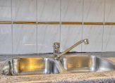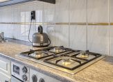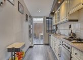De keuken is via een fraaie sfeervolle houten schuifdeur te bereiken en aan de achterzijde gelegen. Deze is opgesteld in een rechte opstelling met bovenkasten en kunststof werkblad met dubbele spoelbak. Verder is de keuken voorzien van een 4-pits gaskookplaat, afzuigkap en losse vaatwasser.