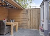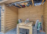 De tuin is vanuit de openslaande deur in de keuken te bereiken en is sfeervol en knus ingedeeld. De tuin is grotendeels betegeld en beschikt over een kleine border met vijver. De houten schuur en overkapping zijn in één geheel gemaakt en geven je een gezellig gevoel. De achtertuin is gelegen op het westen en kan via de deur aan de zijkant worden verlaten.
