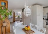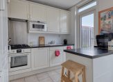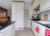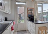 De keuken is gelegen aan de achterzijde. De keuken is in 2014 geplaatst in een L-vormige opstelling met een speels schiereiland. De keuken is afgewerkt met een zwart houten werkblad en witte fronten. Het schiereiland verbindt de keuken gezellig met het eetgedeelte. Daarbij is de ruimte voorzien van de volgende inbouwapparatuur: