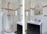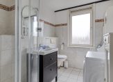 De badkamer op deze verdieping is volledig functioneel, maar wat gedateerd. De ruimte is voorzien van lichte vloer- en wandtegels, een douchehoek, een wastafelmeubel, een vrijhangend toilet en een opstelplaats voor de wasmachine.