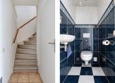 Tussen de keuken en het zitgedeelte ligt de tweede hal. In deze tweede hal bevindt zich de toiletruimte met een vrijhangend toilet en een fonteintje. De toiletruimte is netjes en sfeervol betegeld met een mix van lichte en donkere tegels. Via de tweede hal kunt u de bovengelegen verdieping bereiken.