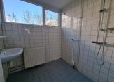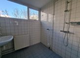 Direct naast de derde slaapkamer bevindt zich de badkamer. De badkamer is volledig tot het plafond betegeld en beschikt over witte wand- en blauwgrijze vloertegels. De badkamer beschikt over een douche, wastafel en opstelplaats voor de wasmachine. In de badkamer is dubbele beglazing aanwezig.