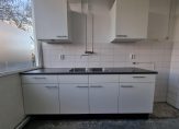 Aan de voorzijde van de woonverdieping bevindt zich de keuken. De keuken is opgesteld in een rechte opstelling met bovenkasten en beschikt over een dubbele spoelbak en een kunststof werkblad. Er is een gasaansluiting aanwezig om een gasfornuis naast de keukenopstelling te plaatsen.