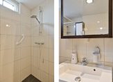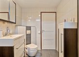 De gemoderniseerde badkamer is neutraal afgewerkt en volledig betegeld met witte wandtegels en grijs/bruine vloertegels. De badkamer bestaat uit een ruime douchehoek met thermostaatkraan, een zwevend toilet, wastafelmeubel, badkamerkast en een designradiator. Een klein raam zorgt voor voldoende daglicht en extra ventilatie.