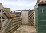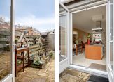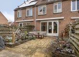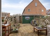 Door de achterpui met openslaande deuren en grote raampartij is er veel licht in de keuken en is er toegang tot de zonnige achtertuin op het zuiden. Hier kun je in de zomer vrijwel de hele dag wel een plek in de zon vinden. Terrastegels en borders wisselen elkaar af en achter in de tuin is er een houten berging en de uitgang richting de achtergelegen poort.