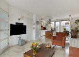 Via een kleine voortuin kom je bij de entree van de woning. Hier stap je in een hal met meterkast, garderobehoek en toiletruimte. De toiletruimte is half betegeld en beschikt over een zwevend toilet. Vanuit de hal stap je de sfeervolle en lichte woonkamer binnen. Op de vloer ligt een fraaie travertinvloer met daaronder comfortabele vloerverwarming. De wanden zijn voorzien van spachtelputz en het plafond is strak gestuct. De woonkamer biedt voldoende ruimte voor een goede zit- en eethoek en er is een praktische trapkast.