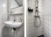 Tot slot de inpandige badkamer en toiletruimte. Beide zijn simpel maar verzorgd afgewerkt. De separate toiletruimte beschikt over een combinatie van zwarte vloertegels en witte wandtegels en is voorzien van een toilet en fonteintje. De naastgelegen badkamer is in dezelfde kleurstelling afgewerkt en is voorzien van