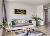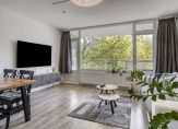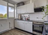 De woonkamer is heerlijk ruim en licht vanwege de grote raampartij. Er ligt een nette laminaatvloer in goede staat en de wanden zijn voorzien van een keurig behang. Een mooie ruimte voor de zithoek en de eethoek. Vanuit de woonkamer kun je ook het zeer royale balkon van bijna 17 vierkante meter bereiken. Het balkon is gelegen op het zuiden en heeft een mooi groen uitzicht.