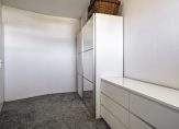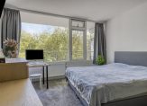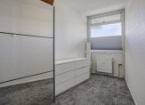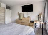 De masterbedroom is aan de balkonzijde gelegen. Een mooie royale slaapkamer die vanwege de ligging in de ronding van het gebouw steeds breder uitloopt. Hier ligt een net tapijt op de vloer en behang op de wanden. Aan de voorzijde de tweede slaapkamer die een goed formaat heeft voor werkkamer of kinderkamer.