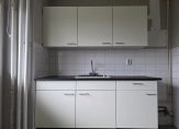 De keuken is gelegen aan de galerijzijde en beschikt over een recht keukenblok met bovenkasten met kunststof aanrechtblad, witte fronten en spoelbak. De keuken heeft een mooi formaat waardoor er gemakkelijk een eethoek gerealiseerd kan worden. In de keuken bevindt zich ook de opstelplaats van de wasmachine.