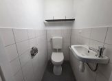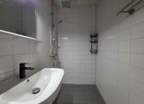In het midden van het appartement is de toiletruimte met staand toilet en fonteintje gelegen. Hiernaast bevindt zich de badkamer met douchehoek en wastafel. Zowel de badkamer als toiletruimte zijn afgewerkt met een lichtblauwe vloer en witte wandtegels.