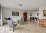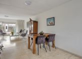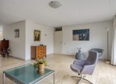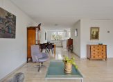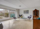 De woon-eetkamer heeft een L-vorm en is ruim van formaat. Op de vloer ligt een fraaie travertinvloer met daaronder comfortabele vloerverwarming (als bijverwarming). Door de grote schuifpui die toegang biedt tot de tuin komt er veel daglicht de woonkamer binnen. Voor de warmste dagen van het jaar is er een breed elektrisch zonnescherm.