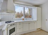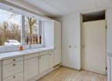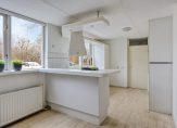De keuken bevindt zich aan de voorzijde en beschikt over grote raampartijen die zorgen voor veel daglicht en uitzicht op groen. De keuken is licht uitgevoerd met witte fronten en een wit aanrechtblad. Een grote schuifkast zorgt veel bergruimte. Verder treft u in de keuken;