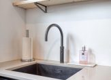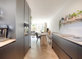 Aan de voorzijde is er de moderne en luxe keuken uit 2022 met zwarte fronten en composiet aanrechtblad. De keuken heeft 2 rechte keukenopstellingen met veel werkbladruimte, lades en een hoge kastenwand. De keuken is voorzien van uitgebreide keukenapparatuur waaronder: