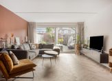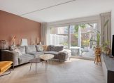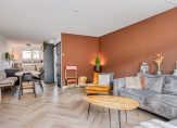 De tuingerichte en uitgebouwde woonkamer met grote schuifpui is heerlijk licht en ruim. De wanden zijn strak afgewerkt en op de vloer ligt een warme visgraat pvcvloer met daaronder comfortabele vloerverwarming.