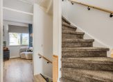 Via een kleine voortuin kom je bij de entree van de woning. In de hal tref je de meterkast, een hoek voor de garderobe, een toiletruimte, trapkast en trap naar de verdieping. De toiletruimte met wandcloset en fontein is fraai afgewerkt met prachtige blauwe en grijze tegels.