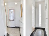 Via de fraai aangelegde voortuin, die in het voorjaar en zomer rijk in bloei staat, kom je bij de entree van de woning. Je kan hier beschut staan, door de fraaie ronde poort die voor de woning is gebouwd. Bij binnenkomst kom je eerst in de vestibule met meterkast, glas-in-loodraampartijen en granitovloer. Hiermee weet je meteen dat je een jaren ’30 woning bent binnengestapt!