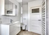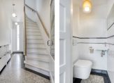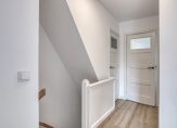 Vanuit de vestibule kom je in de hal met de toiletruimte en toegang naar de kelder en met een trap naar de verdieping. Ook in de hal ligt een schitterende granitovloer. Een smal, maar lang raam naar de keuken brengt extra licht naar binnen en geeft een speels effect. De toiletruimte is modern uitgevoerd met zwevend toilet, fontein, witte wandtegels en granitovloer. De kelder is een ideale ruimte voor bijvoorbeeld het koel houden van levensmiddelen.