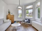 De leefkeuken en de woonkamer worden gescheiden door de originele, glas-in-lood en-suitedeuren met vaste kastruimte. De voorgevel loopt schuin weg, waardoor je mooie zichtlijnen hebt richting de straat. De woonkamer is een knusse ruimte met eveneens fraaie glas-in-loodramen.