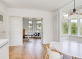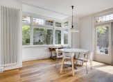 Vanuit de hal kom je direct in de leefkeuken met een fantastische erker met schitterende glas-in-loodramen en openslaande deuren naar de tuin op het zuiden. Hiermee is dit een heerlijk lichte en sfeervolle ruimte met voldoende plek voor een grote eettafel. De wanden zijn strak afgewerkt en op de vloer ligt een massief eikenhouten vloer.