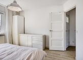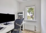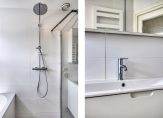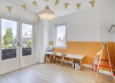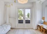 Via de overloop zijn alle vertrekken te bereiken. De trap naar de zolder is afgesloten met een deur, waardoor de warmte niet naar boven verdwijnt. Aan de achterzijde is er een badkamer en een ruime ouderslaapkamer met inbouwkast en zijraam. De badkamer is in 2021 vernieuwd en uitgebouwd. Hierdoor is er een ruime badkamer ontstaan met ligbad, inloopdouche, wastafelmeubel, zwevend toilet en designradiator. De badkamer is warm uitgevoerd met witte wandtegels en zandkleurige vloertegels. Aan de voorzijde zijn er 2 slaapkamers. De voormalige badkamer is nu een compacte werkkamer die uitstekend geschikt is als babykamer of hobby-/werkruimte. De andere slaapkamer is een ruime kamer met een vaste kast, zijraam en openslaande deuren naar een balkon dat uitkijkt over het plein. De wanden op deze verdieping zijn strak afgewerkt en op de vloer ligt een lichte laminaatvloer.