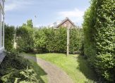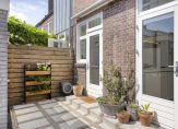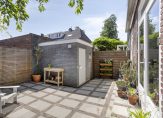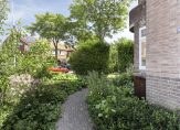 Ook van de tuin hebben de eigenaren een sfeervolle plek weten te maken. De tuin loopt via de voortuin langs het huis door naar achter. Beplanting, struiken, bestrating, gazon, moestuin en heerlijke fruitbomen als appel, amandel en peer wisselen elkaar af. Zo kun je in het voorjaar genieten van prachtige bloesems, eet je bramen in de zomer en peren in de herfst. Door de ligging rondom de woning is er altijd wel een plek in de zon of schaduw te vinden. Een stenen berging staat achterin de tuin met ruimte voor een aantal fietsen.