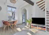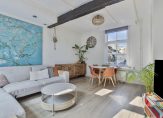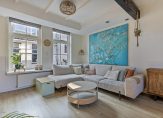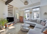 De woonkamer is heerlijk licht door de grote, hoge ramen. Een echte sfeermaker en authentiek detail zijn de bovenramen, de roedeverdeling die in alle ramen beneden terugkomt en de mooie houten balk in de woonkamer. Er is nu gekozen voor de indeling met de bank aan de voorzijde, eethoek aan de achterzijde en aansluitend de keuken. De gehele ruimte is uitgevoerd met een fraaie laminaatvloer en nette wandafwerking.