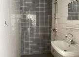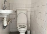 In het midden van het appartement is de toiletruimte met staand toilet en fonteintje gelegen. Direct daarnaast bevindt zich de badkamer met douchehoek en de wastafel.