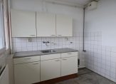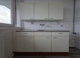 De keuken is gelegen aan de voorzijde en afgesloten van de woonkamer. Het keukenblok is opgesteld in een rechte opstelling met bovenkasten en is voorzien van een kunststof werkblad met spoelbak. Naast het keukenblok bevindt zich de gasaansluiting en een extra wateraansluiting.