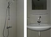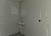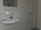 De badkamer en toiletruimte liggen tussen de slaapkamers en de keuken in. Beide afgewerkt met lichtblauwe vloertegels en witte wandtegels. De toiletruimte beschikt over een staand toilet met fonteintje. De badkamer beschikt over een ruime douchehoek, wastafel en opstelplaats van de wasmachine. De wasdroger zou hier eventueel op kunnen worden gezet.