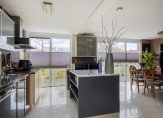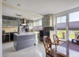 De hal biedt toegang tot de gezellige woon-eetkamer met tegelvloer. De woon- eetkamer is heerlijk licht door de hoge raampartijen die van vloer tot plafond lopen en die prachtig uitzicht bieden op de tuin en de waterpartij met het groen. Via een kleine schuine wand is de keuken afgescheiden van de woonkamer, waardoor de woonkamer knusser aanvoelt en je vanuit hier geen zicht hebt op de keuken.