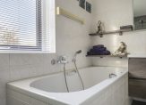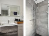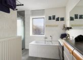 De badkamer is eveneens een ruime en lichte ruimte met wastafelmeubel, ligbad en inloopdouche. Daarnaast is er separaat een toiletruimte met zwevend toilet met fontein.